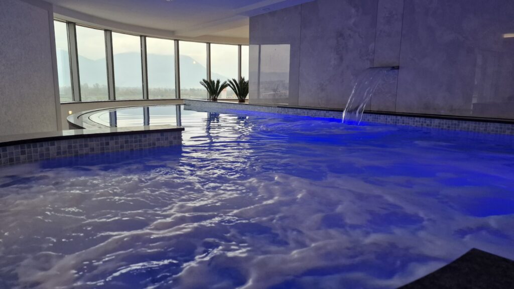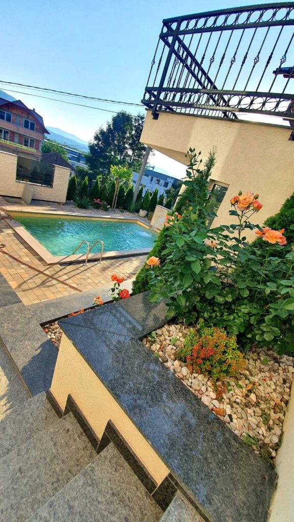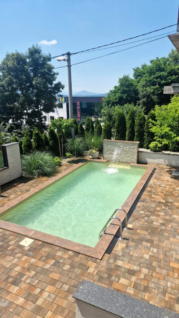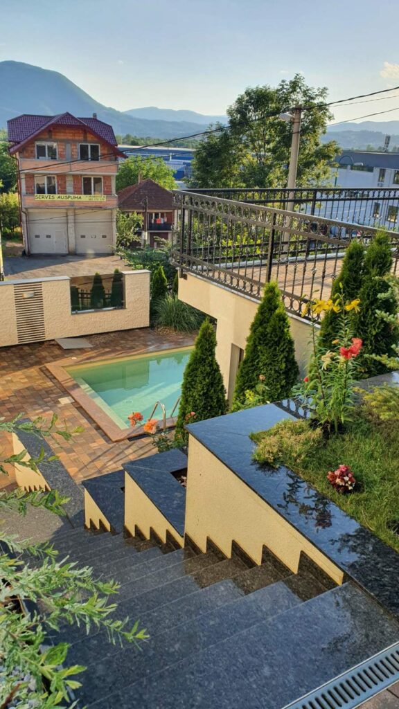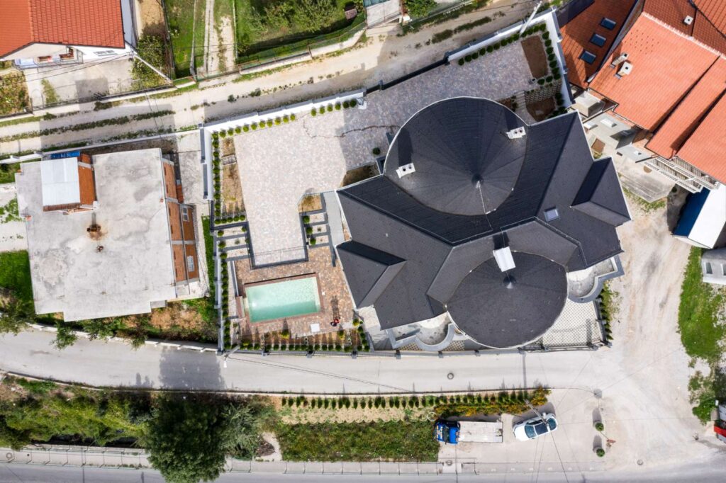 Na potkrovlju zgrade se nalazi showroom sa unutrašnjim bazenom. Ispred kuće postoji i vanjski bazen.